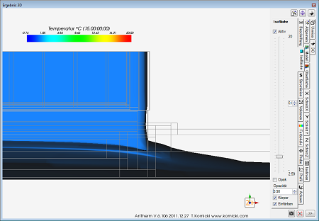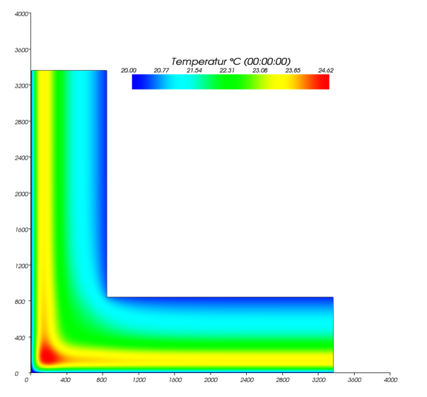 According to EN ISO 10211 (ÖNorm EN ISO 10211, 2007) the calculation model - a horizontal section through the edge - is bounded by adiabatic layers at a distance of 2.52 m from the edge, measured on the inside. Fig. AnTherm modeling of solid brick wall edge - 2D Elements window 3D corner foundation slabIn most cases calculating earth-bounding components requires a three-dimensional modeling. Two-or even one-dimensional calculation models can not meet the demands of highly accurate predictability. On the other side, wide areas around the building are affected by the heat flow from the inside. For this reason, the heat storage capacity of the soil plays a very important role. Consequentely the calculation must be time-dependent (transient). The corner of a foundation slab of a building in passive house standard is going tob e examined. The corresponding outer wall should be modeled to a height of one meter, as well. The basic system consists of a 20 cm thick reinforced concrete foundation slab, which rests on 20cm extruded polystyrene foam (XPS). The outer wall is a wood stud wall, filled with glass wool insulation - inside with a layer of plasterboard installation completion, outside a 20cm layer of EPS or XPS. The wall structure is 46 cm thick and consists of (seen from outside):