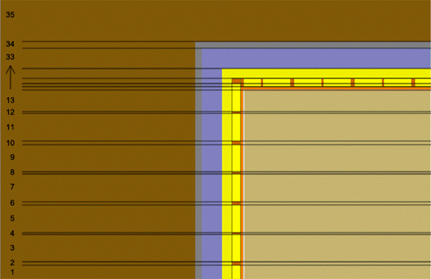 Detail Plans were provided by the company Wolf Haus Austria. Fig. 2D detail - base slab connecting to external wall (© Wolf Haus Austria) Fig. AnTherm modeling of the foundation slab, exterior walls and surrounding soil - 2D Elements window Fig. AnTherm modeling of the foundation slab, exterior walls and surrounding soil - 3D Elements window